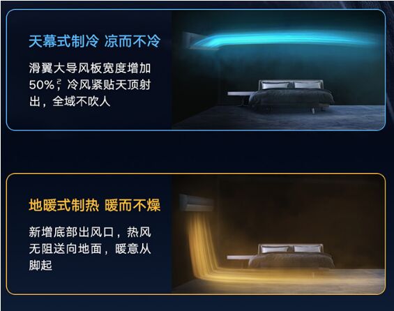 格力星海掛機空調,作為格力2023年亮相的新品空調同樣能夠實現冷暖分送,有上下兩個出風口,擴壓角升級至65°,導板寬度增加50%,讓空調風能夠貼墻壁送出。制冷時,導板將冷風向上送出,實現“天幕式制冷”,讓房間涼而不冷,制熱時,底部出風口讓熱風無阻礙地送向地面,腳暖了,入睡就會更簡單,睡夢更香甜。