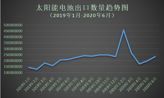 據海關數據顯示,2020年6月中國太陽能電池出口數量為2.3億個,同比增長11.37%;1-6月太陽能電池累計出口數量為13.2億個,較去年同期增長29.64%。2020年6月中國太陽能電池出口金額為15.3億美元,同比下跌4.42%;1-6太陽能電池累計出口金額88.5億美元,較去年同期下跌7.59%。