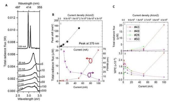 當在實驗中不斷加大電流時,研究小組又有了一個驚人發現。雖然 LED 起初在一定波長范圍內發光,但其最終會縮小為深紫色的兩個波長,他們的微型 LED 竟然變成了一個微小的激光器,實驗記錄到的電流密度為 1000 kA/cm 2,LED 轉換為激光,亮度超過 20 微瓦。 “將 LED 轉換成激光需要很大的努力。通常,需要將 LED 耦合到諧振腔,諧振腔才能使光線反彈以產生激光。” 尼古巴赫說。“但鰭式設計可以獨立完成全部工作。”微型激光器的應用也非常多,不僅在化學傳感方面,而且在下一代手持式通信產品、高清顯示器和消毒方面也是如此。 尼古巴赫認為:“這種全新 LED 設計作為重要的構建基塊具有很大的潛力。” “雖然這不是人們制造的最小的激光器,但它是一個非常明亮的激光器,且不存在效率下降的問題,將會大有用處。” 研究結論中指出,這項發現令人鼓舞,代表了 LED 設計體系結構的重要一步,可以克服 LED 中的 “電流密度下降” 和“溫度下降”效應,以最大化其每個像素可實現的輸出功率。