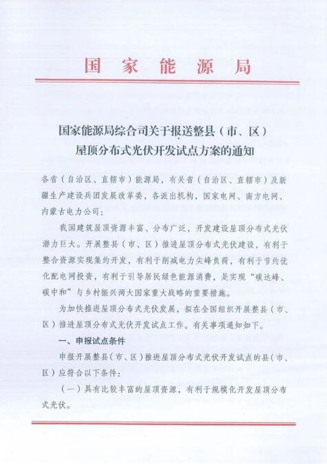 近日,國家能源局綜合司下發《關于報送整縣(市、區)屋頂分布式光伏開發試點方案的通知》。 《通知》指出,我國建筑屋頂資源豐富、分布廣泛,開發建設屋頂分布式光伏潛力巨大。開展整縣(市、區)推進屋頂分布式光伏建設,有利于整合資源實現集約開發,有利于削減電力尖峰負荷,有利于節約優化配電網投資,有利于引導居民綠色能源消費,是實現“碳達峰、碳中和”與鄉村振興兩大國家重大戰略的重要措施。 《通知》還指出了申請試點條件,要求具有豐富的屋頂資源;有較高的開發利用積極性;有較好的電力消納能力;開發市場主體基本落實,開發建設積極性高,有實力推進試點項目建設。 此外,《通知》還提到黨政機關建筑屋頂總面積可安裝光伏發電比例不低于50%;學校、醫院、村委會等公共建筑屋頂總面積可安裝光伏發電比例不低于40%;工商業廠房屋頂總面積可安裝光伏發電比例不低于30%;農村居民屋頂總面積可安裝光伏發電比例不低于20%。 原文如下: