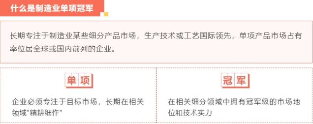 制造業單項冠軍旨在引導制造業企業專注創新和質量提升,在更多細分產品領域形成全球市場、技術等方面領先的單項冠軍地位,提升我國制造業國際競爭力,促進我國產業整體在全球產業鏈中邁向高端。